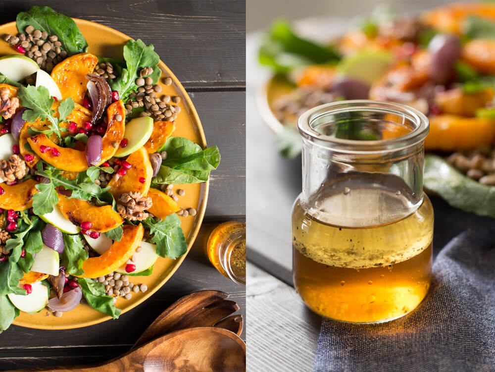 6.На большом плоском блюде разложите рукколу, поджаренные ломтики тыквы и лука, дольки яблока, чечевицу и орехи. Все ингредиенты заправки выложите в банку, накройте крышкой и несколько раз встряхните.