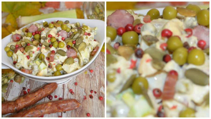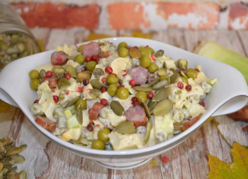 Готовим салат из зеленого горошка с луком-пореем и колбасками