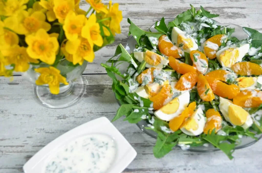 Готовим салат с листьями одуванчика, яйцами и мандаринами