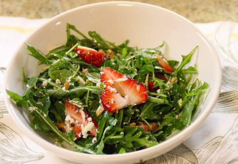 Десертный салат с клубникой и рукколой своим вкусом и ароматом создает праздничное настроение солнечного лета.