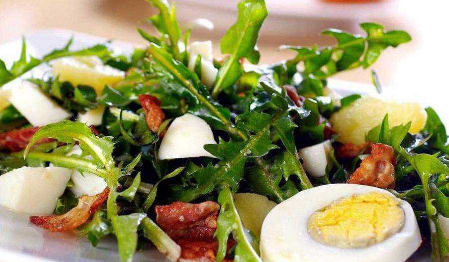 8. Салат из листьев одуванчика с беконом готов к подаче на стол.