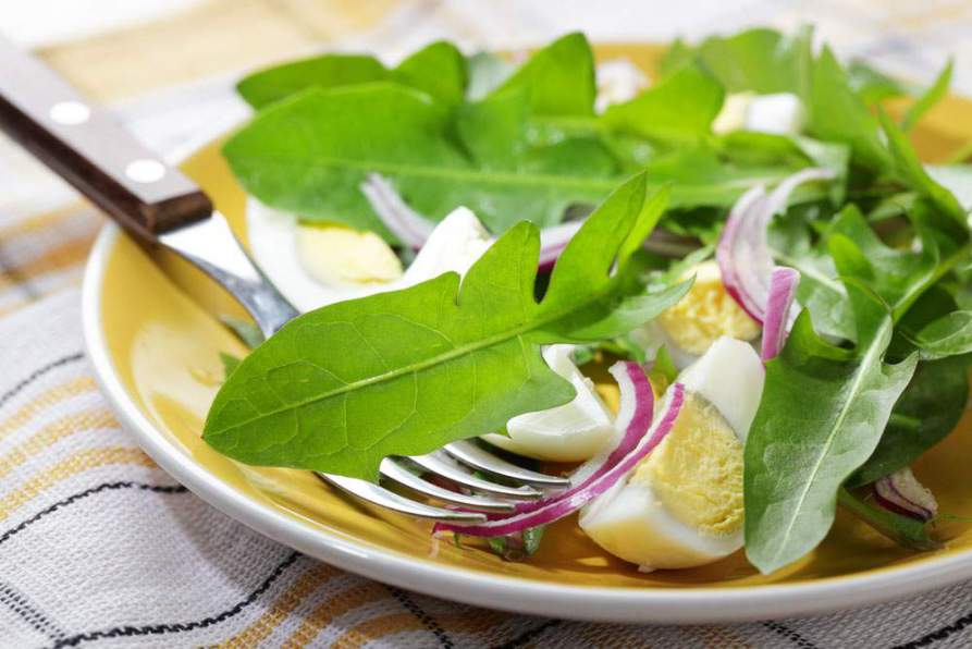 6. Подайте салат из листьев одуванчика с горчицей к столу, выложив на листья четвертинки яиц.