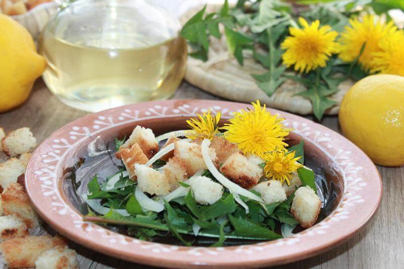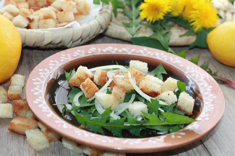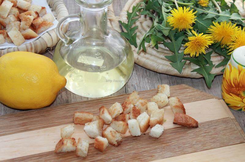 Готовим салат из листьев одуванчика с сухариками