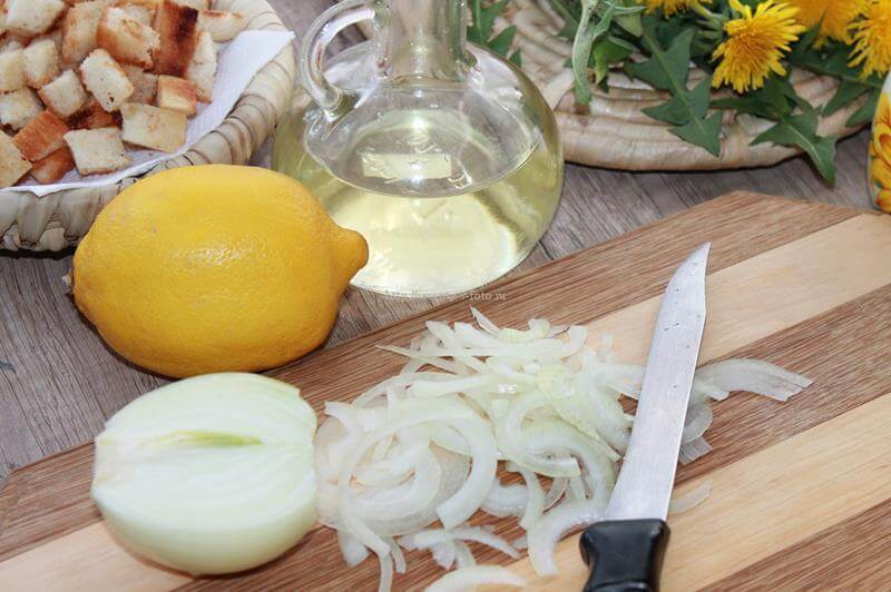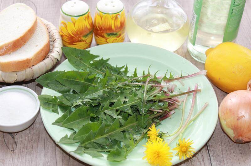 1.Подготовьте все необходимые ингредиенты, указанные в списке. Для салата лучше собрать молодые листья одуванчика с растения, цветки на котором еще не распустились.