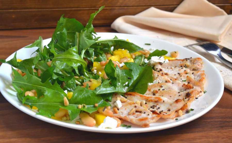 5. В просторном салатнике соедините обсушенные листья одуванчика с консервированной фасолью, сладким перцем, орешками, куриным филе, посыпьте прованскими травами, раскрошите Фету и сбрызните соком лимона. Растительное масло для заправки не обязательно здесь, так как в наборе ингредиентов и так много жира. Но при желании можете добавить немного оливкового масла.