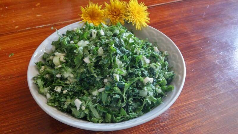 1.Подготовьте всю используемую для салата зелень – переберите, удаляя подсохший материал, и хорошо вымойте под проточной водой. Крапиву кроме промывания залейте на 2 минуты крутым кипятком, а затем снова промойте в холодной воде.