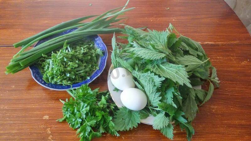 2.Отожмите зелень (крапиву, щавель, петрушку, зеленый лук, молодой чеснок) от излишней воды, мелко нарежьте и сложите в глубокую миску. Если используете зубчики чеснока, очистите их от шелухи, пропустите через пресс и добавьте в миску.