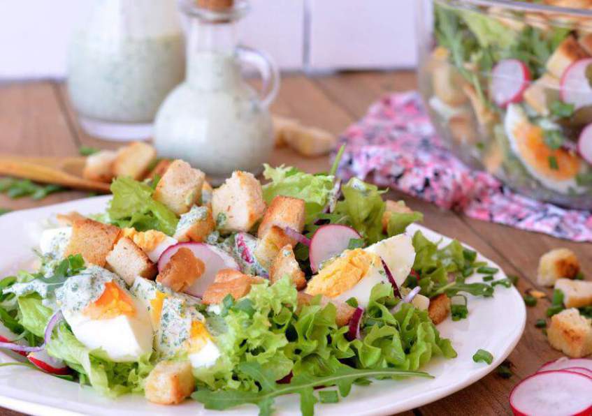 6. В глубоком салатнике аккуратно смешайте листья салата с редисом и луком. Добавьте нарезанные четвертинкам яйца. Обильно полейте салат заправкой и посыпьте сухариками.