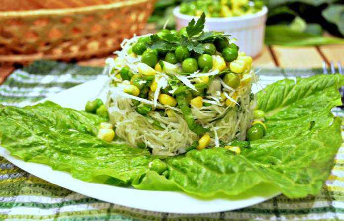 4. Соедините зелень с огурцами в миске, добавьте нашинкованную капусту, кукурузу и горошек. Посолите овощную массу, сбрызните яблочным уксусом, полейте оливковым маслом и перемешайте.