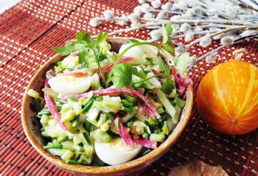 6. Весенний салат из черемши и редьки выложите в салатник, украсьте зеленью и четвертинками яйца.