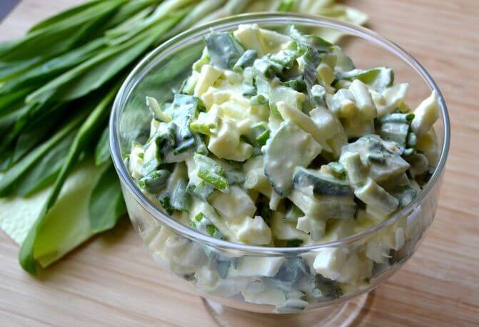 4. Весенний салат из черемши с яйцами и огурцами готов. Разложите его в порционные креманки и подайте к столу как пикантную закуску, в качестве дополнения к гарниру или горячей картошке.