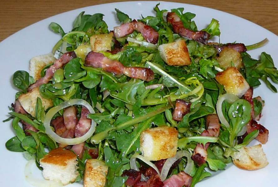 6. Все ингредиенты в салатнике тщательно перемешайте. Взболтайте соус винегрет в банке еще раз и сдобрите им салат из одуванчиков, полевого салата и крапивы с беконом.