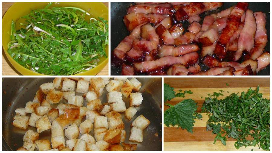 5. Отцедите листья одуванчика от соленой воды и добавьте целыми в салатник с полевым салатом и крапивой. Большие листья можете порвать пополам. Добавьте в салатник жареный бекон, сухарики булки. Молодой лук вымойте, очистите, нарежьте кружками, разделите на отдельные кольца и добавьте в салатник.
