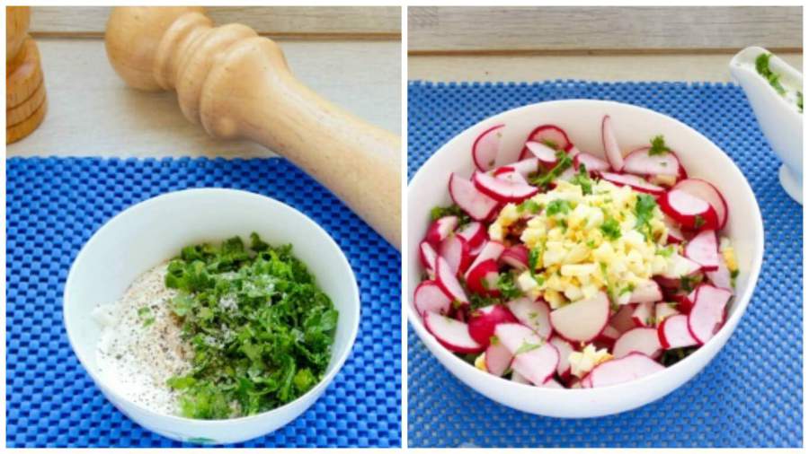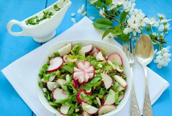 5. Поместите в салатное блюдо черемшу, редис и яйца, полейте салат сметанной заправкой и перемешайте. Сверху украсьте ваш салат цветком из редиса. Подайте весенний салат с черемшой, редисом и яйцами сразу же, после приготовления.