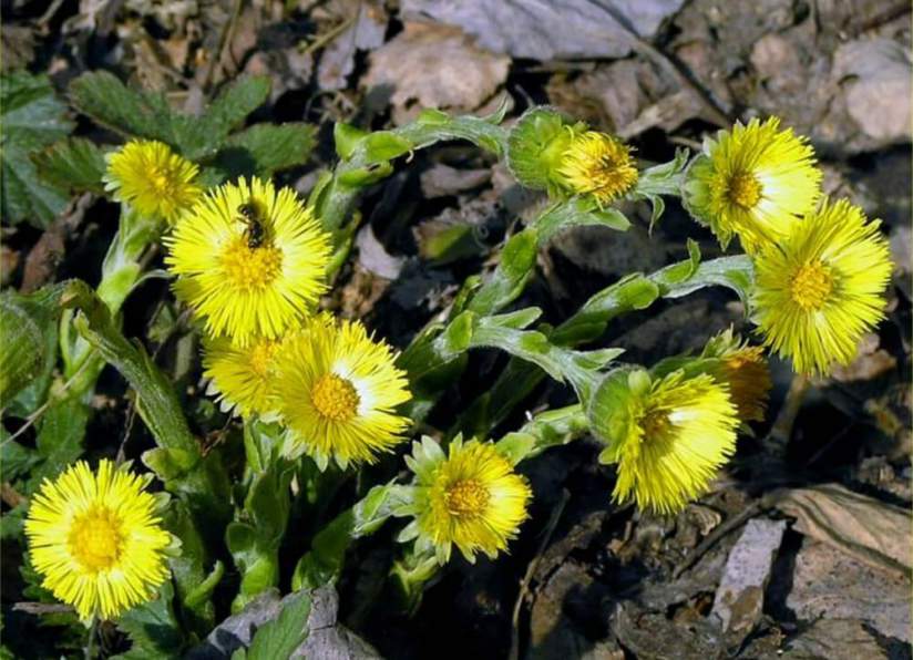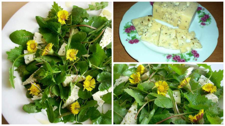 Мать-и-мачеха представляет собой многолетнее растение из семейства сложноцветковых. Ранней весной появляются крупные желтые цветы, похожие на цветки одуванчика, а затем листья. Встретить это растение можно на суглинистых почвах, возле оврагов и на полях. В цветках, как и в других частях растения, содержится много минералов, эфирных масел, органических кислот и других полезных веществ. Такая целительная добавка сделает ваш салат вкуснее и полезнее.