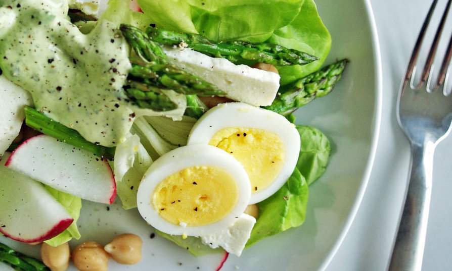 7. На плоское блюдо выложите листья салата, а на него кружки редиса, нут, половинки или четвертинки яиц, Фету и спаржу.