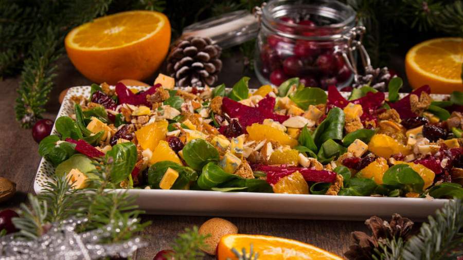 6. На плоское овальное или прямоугольное блюдо выложите поочередно полевой салат, ломтики апельсина, кубики голубого сыра, звезды и кубики свёклы, запаренную клюкву. Полейте заправкой, посыпьте пряниками и миндалем.