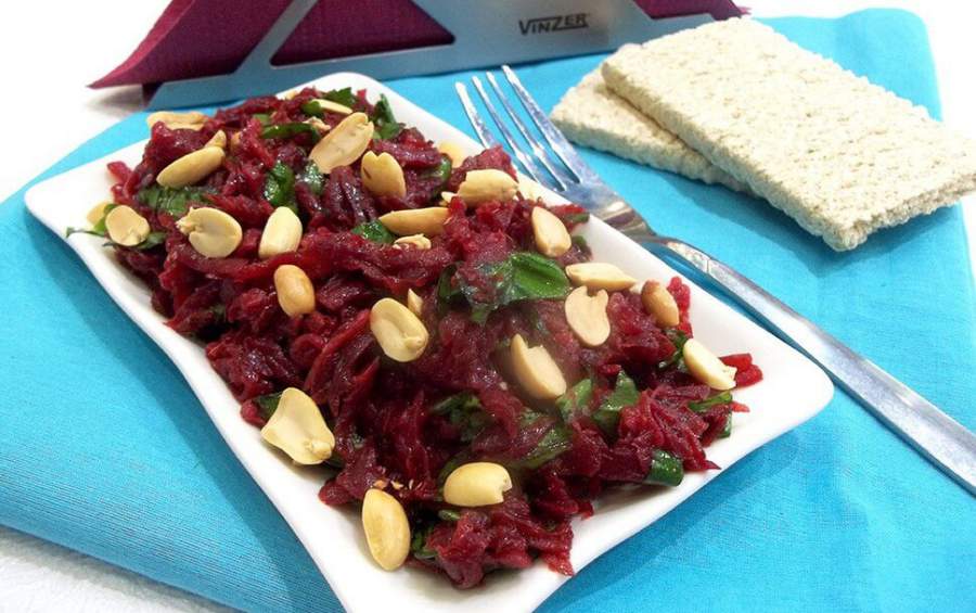 6.Готовый салат из свёклы и черемши переложите из миски на блюдо, посыпьте поджаренным на сухой сковороде арахисом и подавайте к столу.