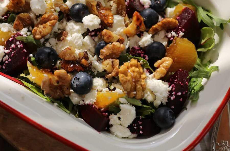 6. Салат из свёклы с апельсином, козьим сыром и медовыми орехами готов к подаче на стол.