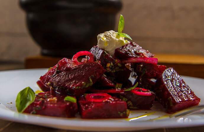 6. Залейте полученной заправкой кусочки свёклы в миске, перемешайте и оставьте мариноваться при комнатной температуре от 30 минут до 1 суток.