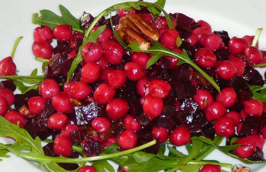 8. Добавленные к салату листья рукколы не только придали салату красоту в виде ярких зеленых штрихов на бордовом фоне, но и обогатили вкус блюда, добавили ему витаминов. Вкусный, сытный и полезный салат со свёклой и нутом готов. Такой салат может использоваться как постное и вегетарианское блюдо.