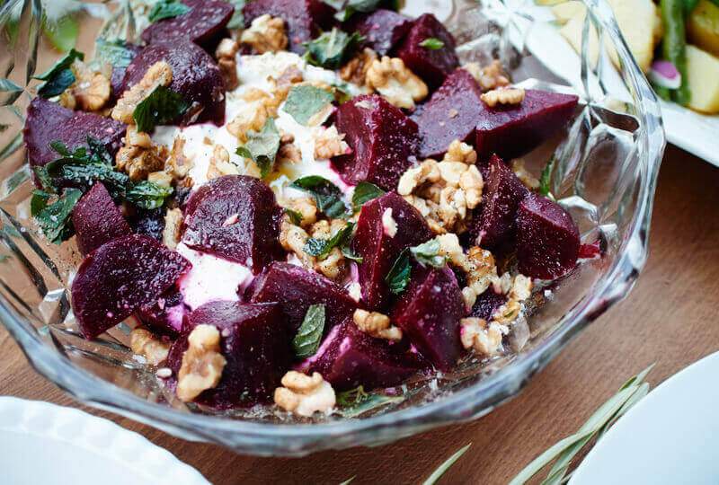 Свекольный салат с йогуртом, свежей зеленью и орехами