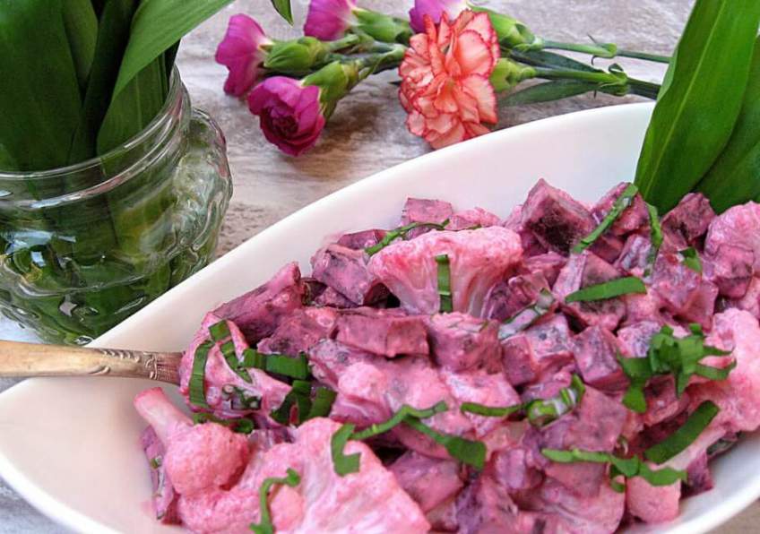 После долгой зимы и небольшое количество зелени в блюде радует свежестью, придавая вкусу особые весенние нотки. Если вам посчастливилось купить небольшой пучок выросшей под робким весенним солнцем черемши, используйте ее для салата. Предлагаем рецепт свекольного салата с цветной капустой и черемшой.