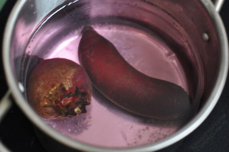 3.Готовность свёклы проверяйте, протыкая ее спичкой. Если спичка легко прокалывает кожуру и входит в мякоть, снимите кастрюлю с огня, слейте кипящий отвар, а свёклу залейте холодной водой.