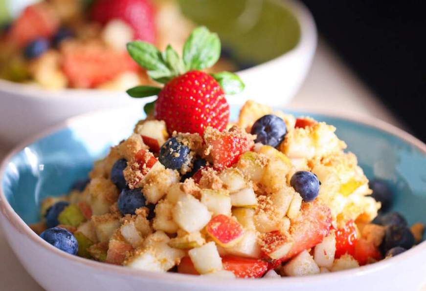 7. Весомость и текстура. «Заземляющую», объединяющую роль в фруктовом салате могут сыграть некоторые вилы круп, орешков и семечек. Тут тоже простор для творческих поисков. Даже отварная пшеничная крупа может придать фруктам в салате сытный и оригинальный оттенок вкуса.