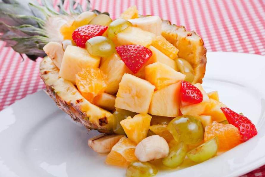 9. Сервировка. Красиво сервируйте свой салат, украшая зеленью, кусочками ярких плодов и ягод. Красивые порционные стаканы, бокалы, креманки придают даже самому простому салату изысканный вид. Оригинально смотрится салат в половинках яблок, груш, чашечках из цитрусовой кожуры, половинках ананаса.