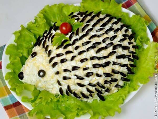 Черные оливки обладают ярко выраженным вкусом, не переусердствуйте с украшением, выложив ежовые «колючки» в умеренном количестве. Иначе такой декор способен перебить вкус всех остальных ингредиентов салата.