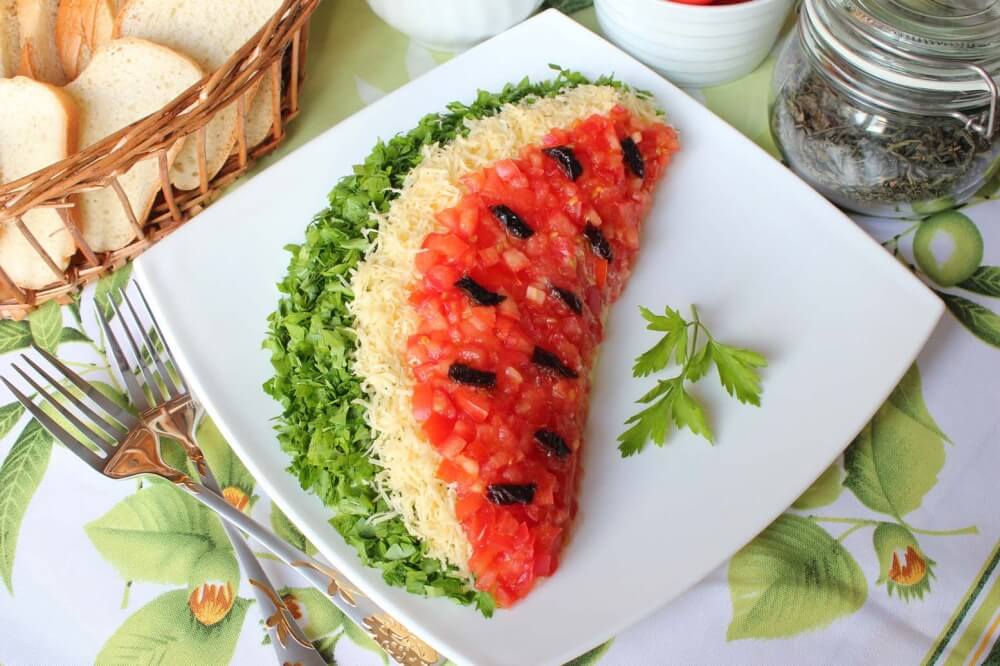 Этот оригинальный салат по внешнему виду напоминает разрезанный арбуз, и очень популярен у домашних кулинаров. Салат «Арбузная долька» дарит ощущение лета, в какое время года он бы не готовился. Известно много разновидностей этого салата по составу продуктов с неизменной формой в виде дольки арбуза.