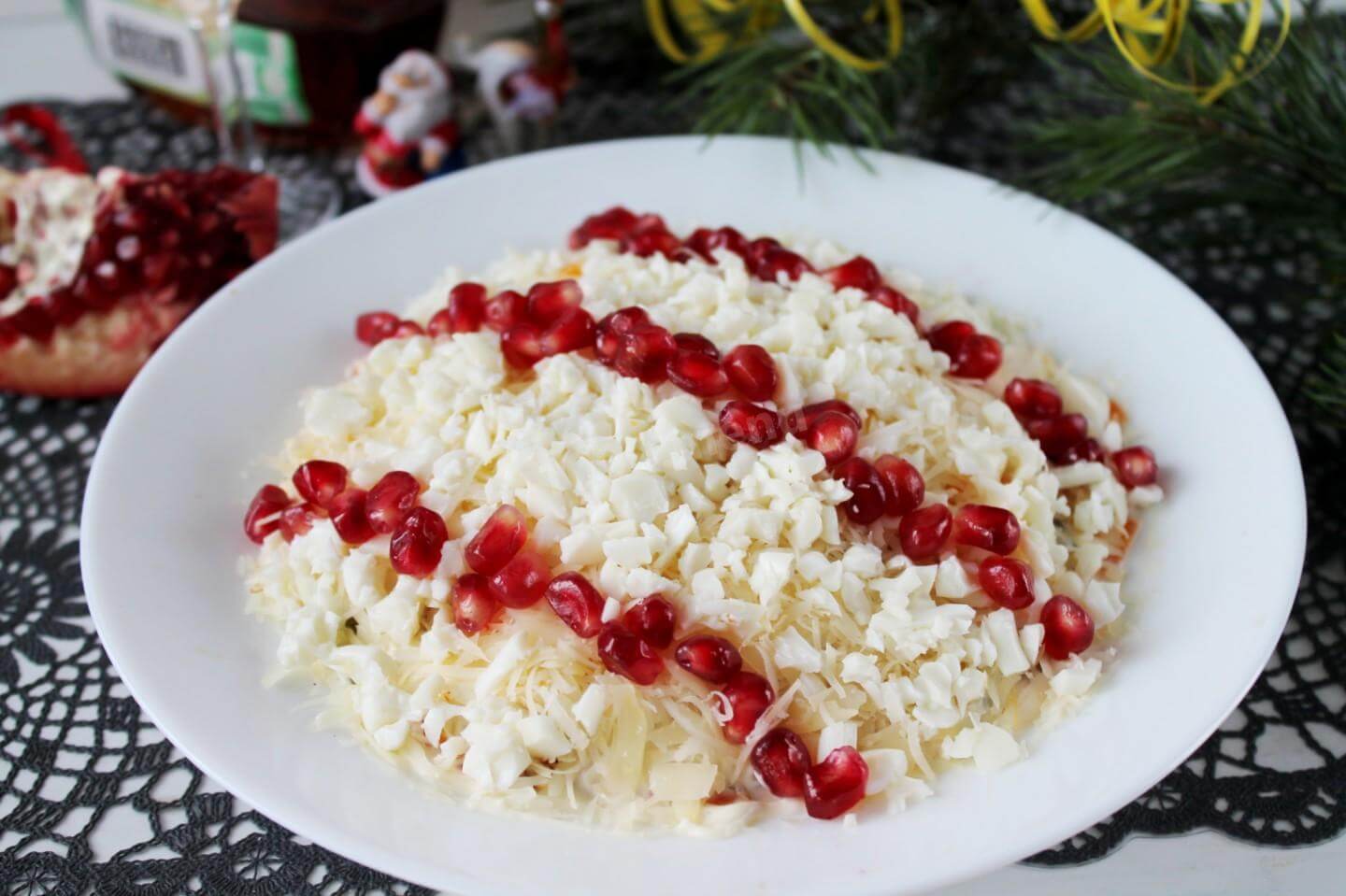 Салат «Бусы на снегу» выкладывается на блюдо слоями и украшается зернами граната, которые создают эффект алых бусинок на белом снегу из тертых яичных белков. Если сварить мясо, морковь и яйца с вечера, на следующий день приготовление салата не займет много времени.