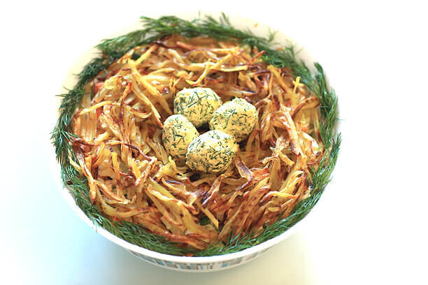 6.Тщательно перемешайте все. Из полученной сырной массы сформируйте небольшие шарики, а затем придайте им овальную форму наподобие яиц и положите в углубление гнезда.