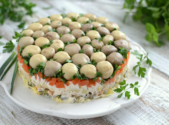 Готовим салат «Грибная поляна» из маринованных шампиньонов с курятиной