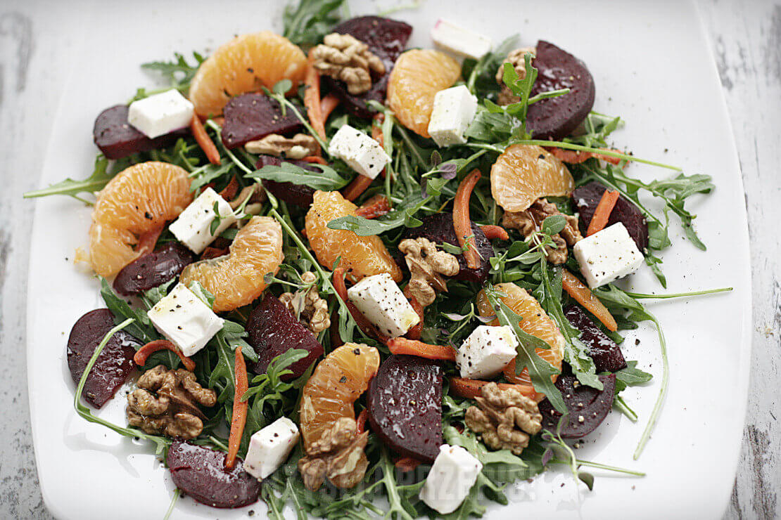 Предлагаем оригинальный рецепт вкусного и здорового салата из свёклы, мандаринов и рукколы. С первого взгляда набор ингредиентов покажется вам несовместимым. Но запеченная свёкла, подпеченная морковь, сочные мандарины, сыр фета, орехи и свежая зелень – эти продукты идеально сочетаются между собой.