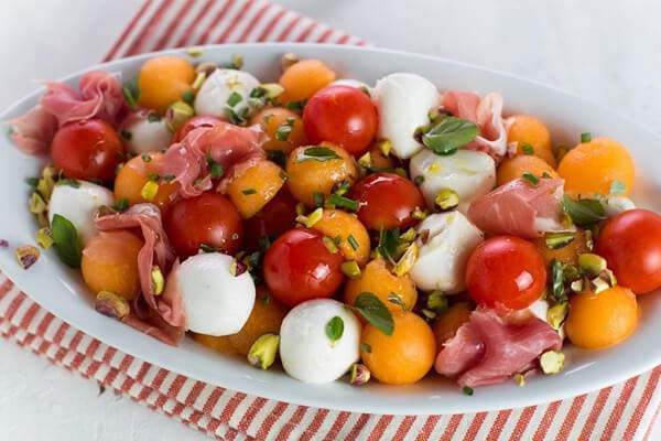 4.На красивое плоское блюдо уложите шарики дыни вперемешку с помидорами черри и моцареллой. Сверху дополните ломтиками ветчины прошутто, украсьте ароматными пряными травами и посыпьте рублеными фисташками в виде крупной крошки.