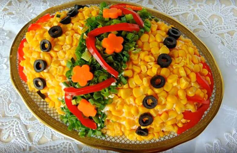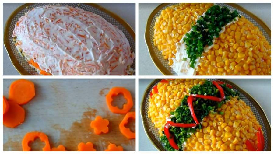 5.Верх и бока уложенной в виде яйца слоеной конструкции накройте слоем тертой моркови, густо смажьте майонезом, сформировав горку в виде яйца. Выложите сверху консервированной кукурузой.