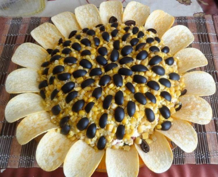 Салат в виде подсолнуха с неизменными чипсами, изображающими лепестки, и черными оливками, изображающими семечки, имеет множество вариантов, от приготовления самого салата до оформления. Предлагаем вашему вниманию интересный рецепт нежного пряного салата «Подсолнух» с уткой и кукурузой, без грибов.
