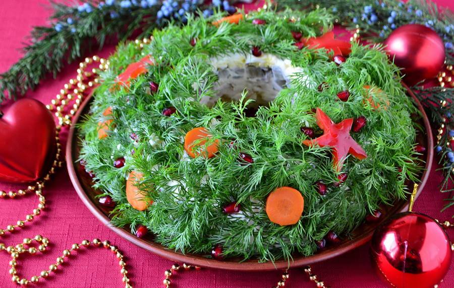 6.Подровняйте салатное сооружение, аккуратно вытащите стакан, укройте всю поверхность кольца веточками укропа, имитируя еловые ветви. Украсьте зернами граната, кружками моркови и звездами из сладкого перца.