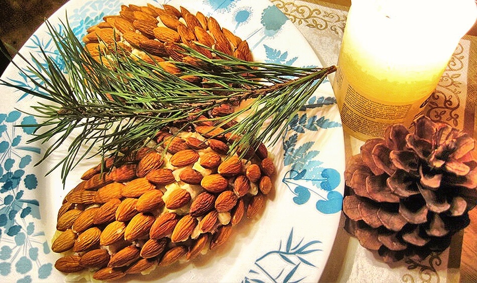 6.Овальные горки салата украсьте миндальными орехами, придавая им окончательное сходство с шишками. Подавайте салат «Сосновые шишки», украсив зеленью или небольшими сосновыми веточками.