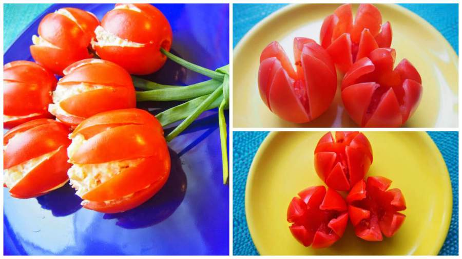 Для салата отбирайте спелые, но упругие помидоры, лучше удлиненной формы для большей схожести с тюльпанами. Цвет помидоров кроме красного может быть желтым, оранжевым, или смесь.