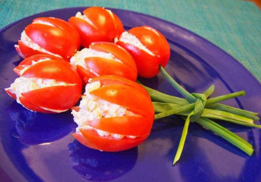 6. Помидоры-тюльпаны с начинкой уложите на красивое плоское блюдо в виде букета. Перья зеленого лука вымойте, обсушите и добавьте к тюльпанам в виде стебельков. Одним из луковых перьев можете связать «букет».