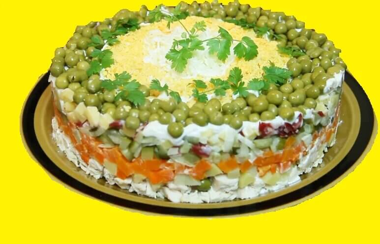5. Начините выкладывать с куриной грудки в такой последовательности: куриная грудка, картофель (половина), морковь, огурцы с луком, колбаса, сыр, снова картофель. Посыпьте сверху яичным желтком и белком, уложите кайму из горошка.