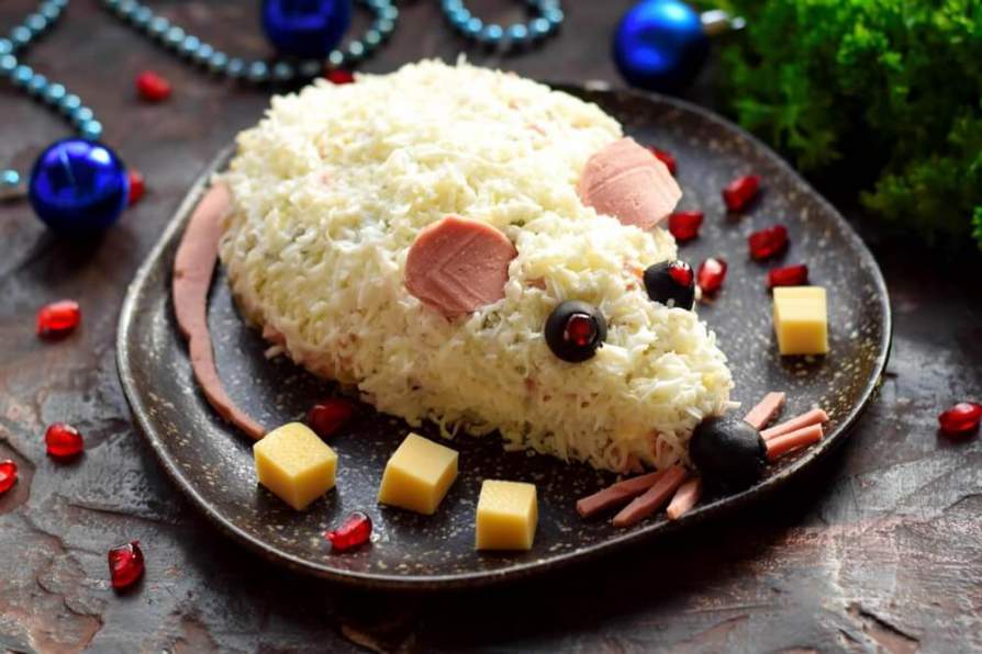 Новогодний салат «Оливье» в форме Крысы имеет состав ингредиентов аналогичный традиционно оформленному салату. Дополнительно добавлены элементы декора, придающие закуске схожесть с символом наступающего года – оливки, сыр, ломтики колбасы, яичные белки.