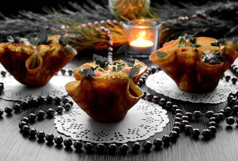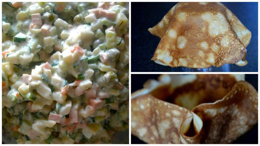8. Когда блинные корзинки полностью остынут, наполните их салатом, украсьте зеленью. Салат Оливье в блинных корзинках сразу подайте к столу.