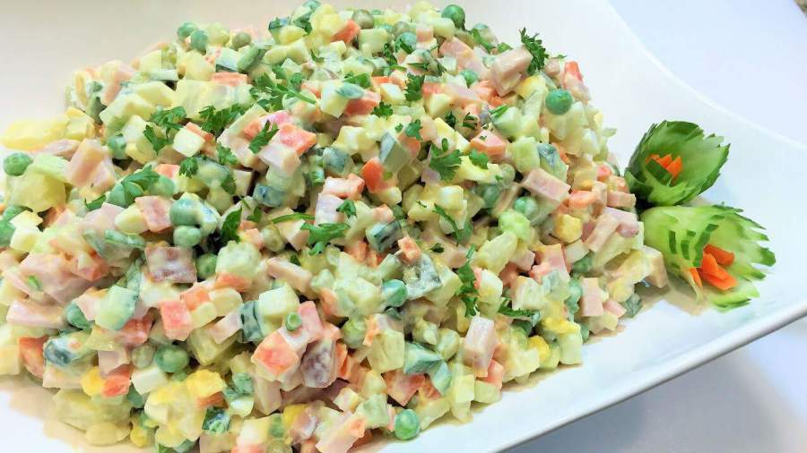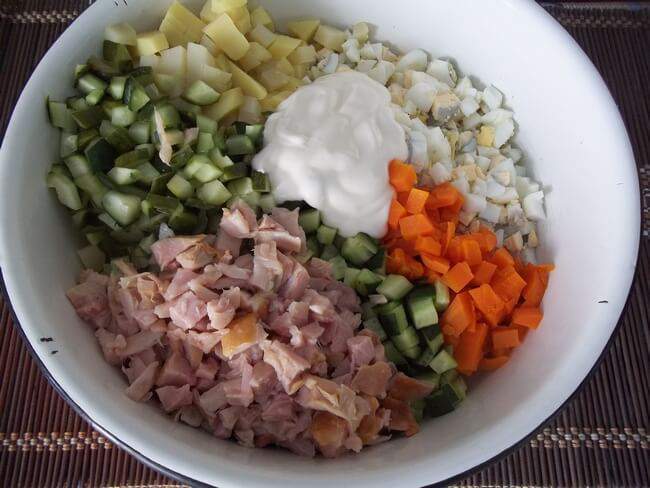 Планируя салат «Оливье» на праздничный стол, помните об одной небольшой детали, которая подскажет, какое количество салата следует готовить, чтобы было достаточно для всех гостей. За основу возьмите картофель. Отварите для салата столько клубней картофеля среднего размера, сколько едоков будет за столом. Остальные же продукты закладывайте пропорционально картофелю.