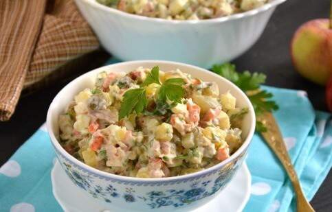 В список ингредиентов добавлено яблоко, что придает салату нотки фруктовой свежести. Зеленого горошка и лука нет в составе, но при желании можете их добавить.