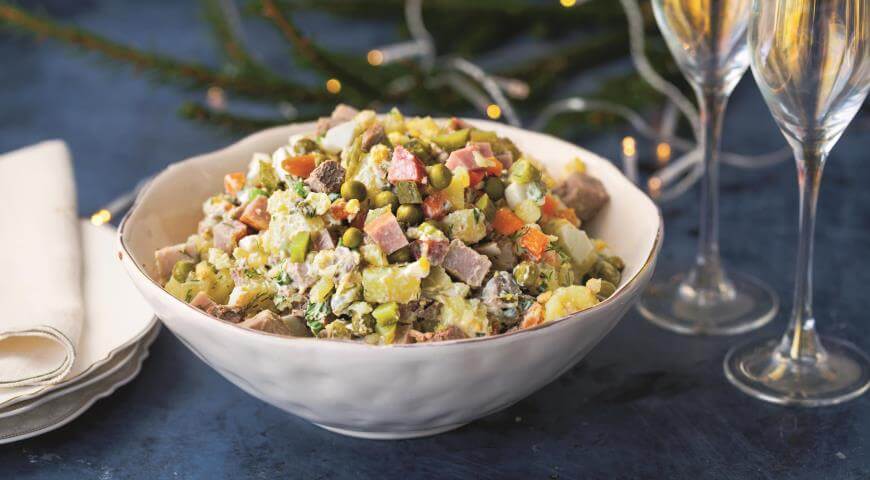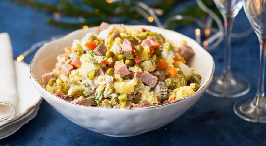 Салат «Зимний оливье» отлично подходит для новогодних праздников и рождественского застолья. Но и для будничной домашней трапезы его можно приготовить. И для домашней трапезы. Этот вариант салата отличается от традиционного «Оливье» богатством мясной составляющей. Согласно рецепту, предполагается использовать не просто колбасу или отварное мясо, но целое ассорти, которое вы можете подбирать по своему усмотрению (вареное или запеченное мясо, язык, буженина, ветчина). Зеленый лук и укроп внесут свежие нотки в эту идиллию зимнего салата.