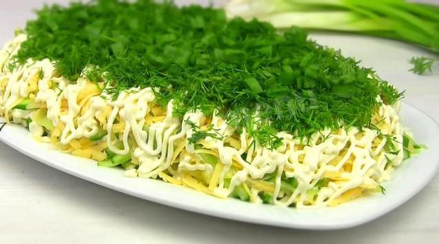 4. Огірок вимийте, наріжте тонкою соломкою або тонкими кружальцями. Укладіть на шар картоплі і також нанесіть сіточку з майонезу. Сир натріть на крупній тертці і покладіть поверх огірків. Нанесіть майонез.